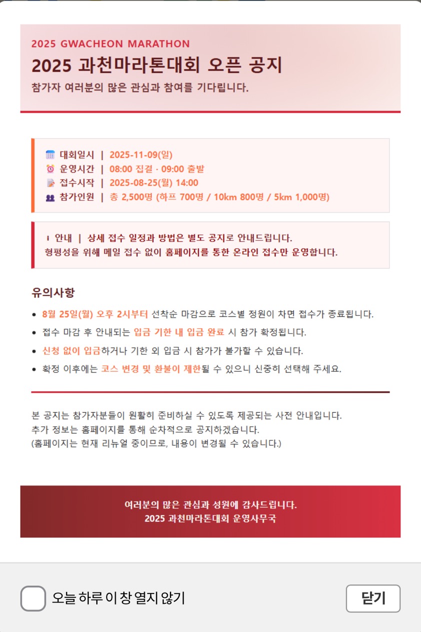 오늘은 경기도 과천시에서 개최되는 ‘과천마라톤’을 소개하고자 합니다.