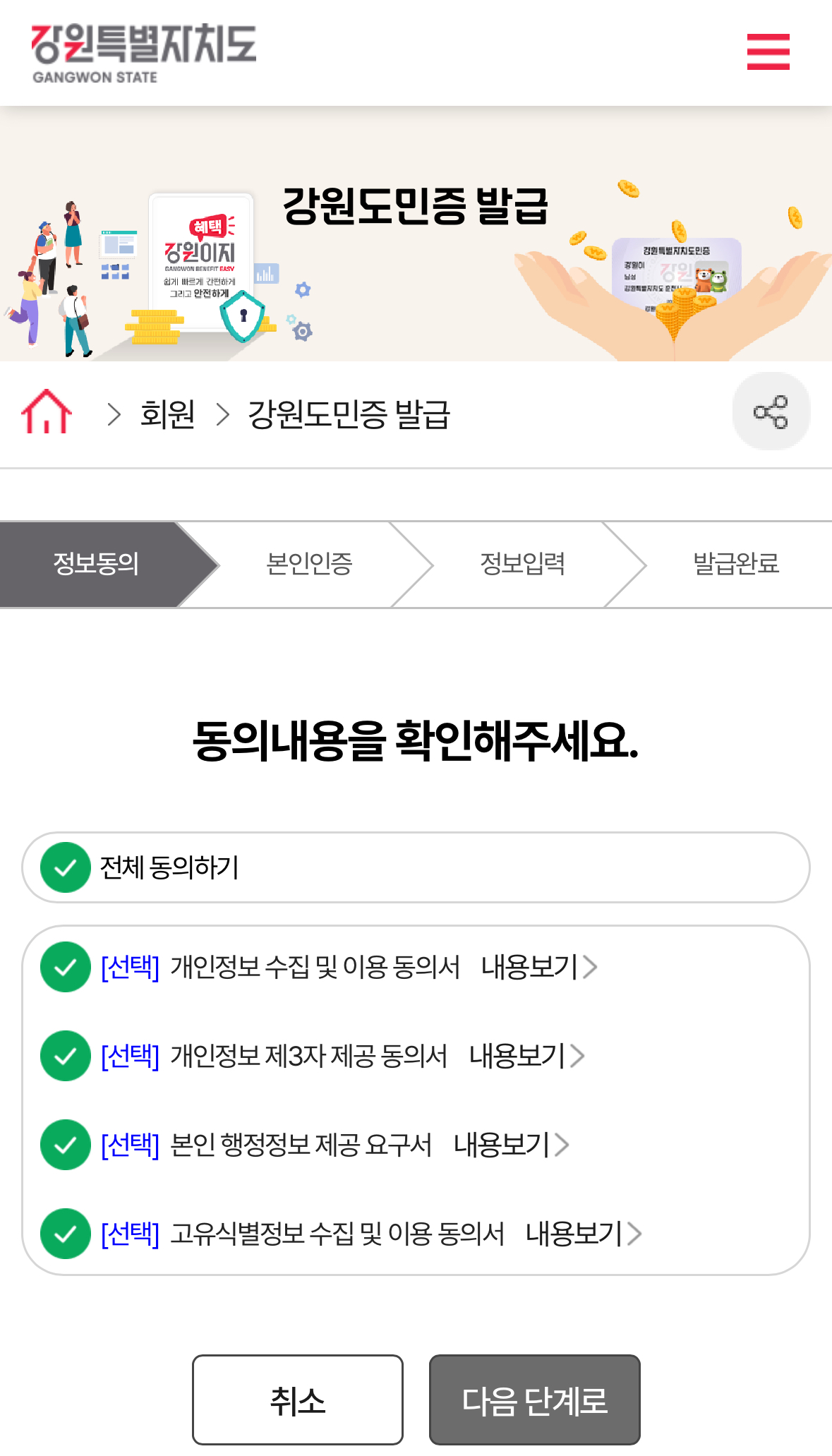 → 반대의 경우엔 강원도민증 발급 절차로 연결됨