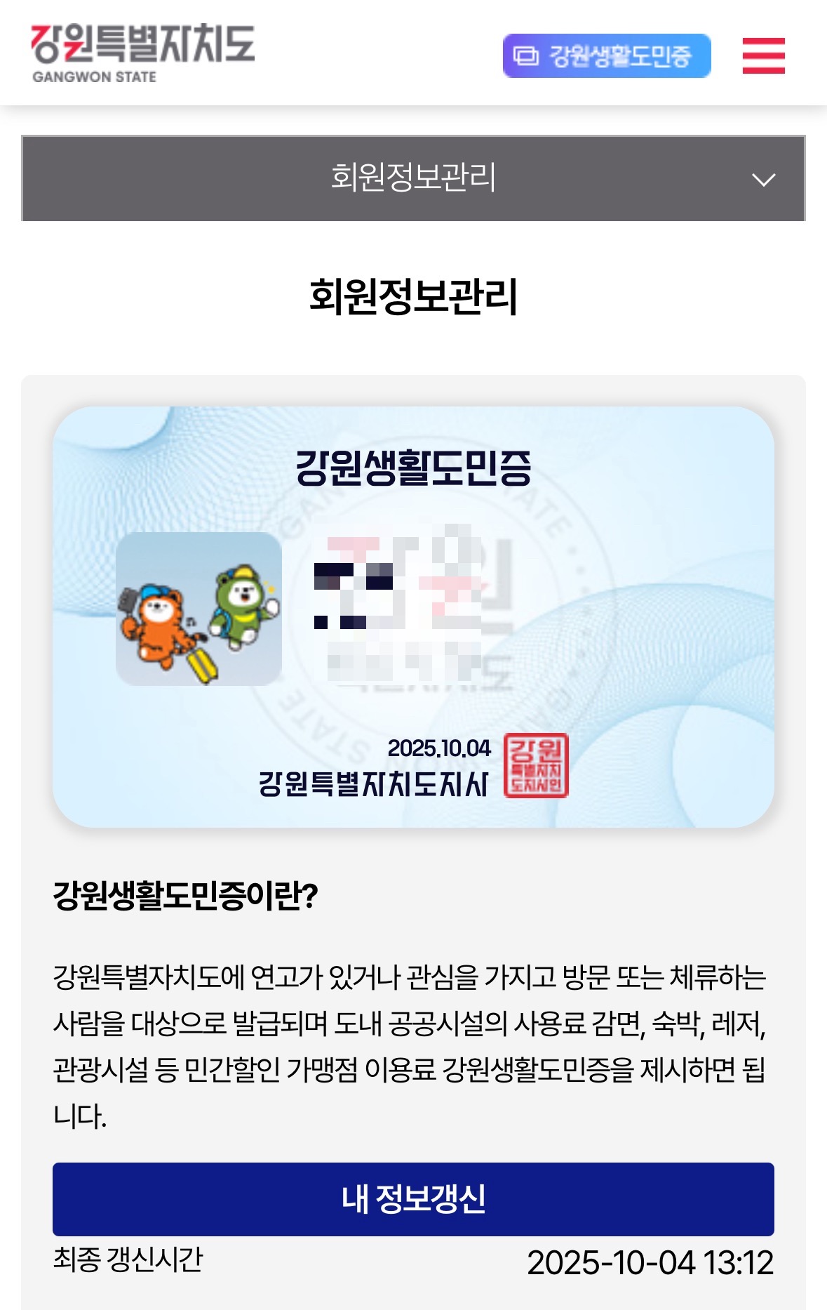 • 강원생활도민제도는 강원 외 지역에 거주하는 사람도 모바일 생활도민증을 통해 강원도의 제휴 혜택을 누릴 수 있는 제도입니다.