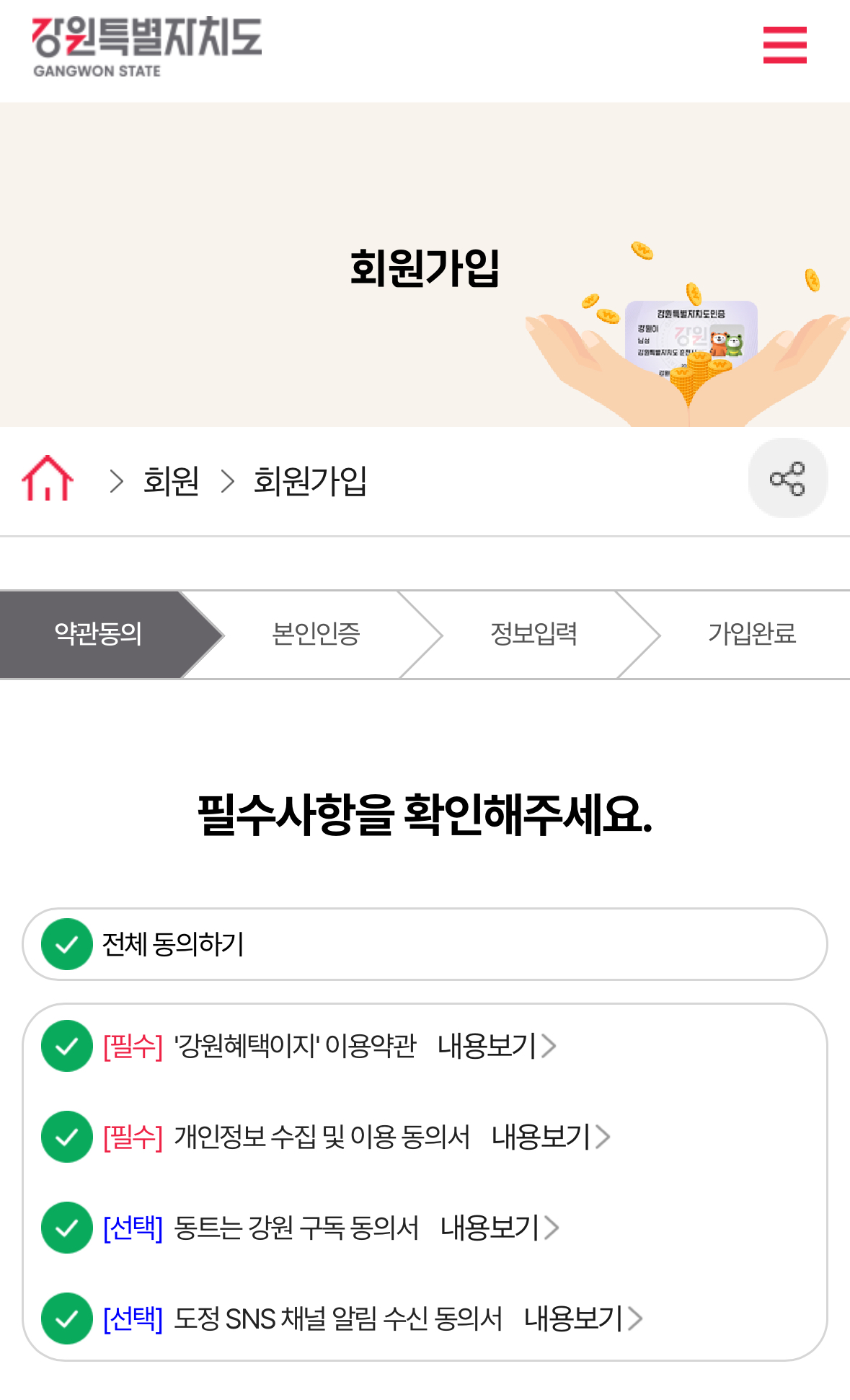 1. 강원혜택이지(easy.gwd.go.kr) 웹사이트 접속 → 회원가입