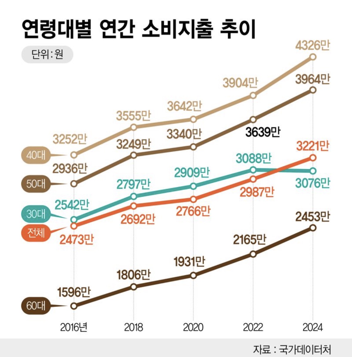 연령대별로 봐도 비슷한 흐름이다. 2016년 대비 2024년 소비지출 증가율은 30대(21.0%)보다 50대(35.0%), 60대(53.7%)에서 더 가파르다. 은퇴 이후에도 소비는 줄지 않고 오히려 생활비 성격의 지출이 고착화되고 있는 것이다.