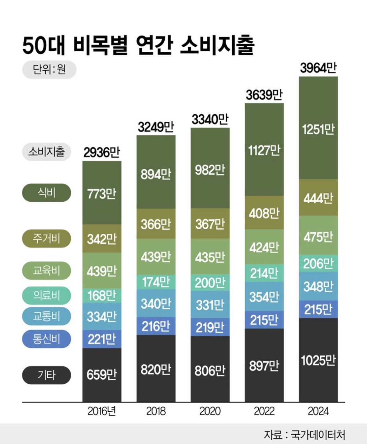 국가데이터처에 따르면 50대 가구의 연간 소비지출은 2016년 2936만원에서 2024년 3964만원으로 8년 새 35% 증가했다. 같은 기간 식료품(식비) 지출은 773만원에서 1251만원으로 61.8% 급증했다. 전체 소비 증가율의 두 배에 가깝다.