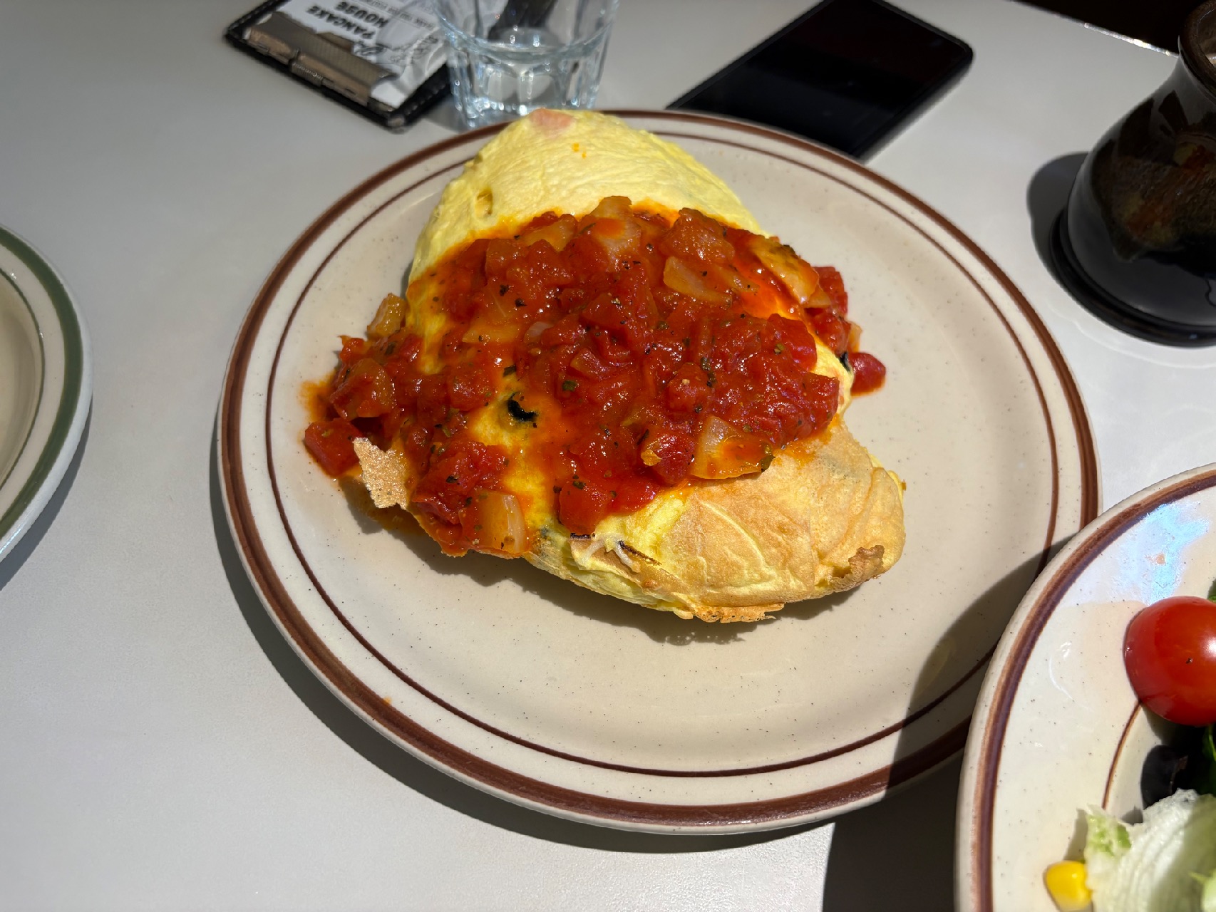 - 오믈렛 & 해쉬브라운: 양이 매우 푸짐합니다. 오믈렛을 주문하면 기본 팬케이크 3장이 함께 제공되어 든든한 한 끼 식사로 손색이 없습니다.