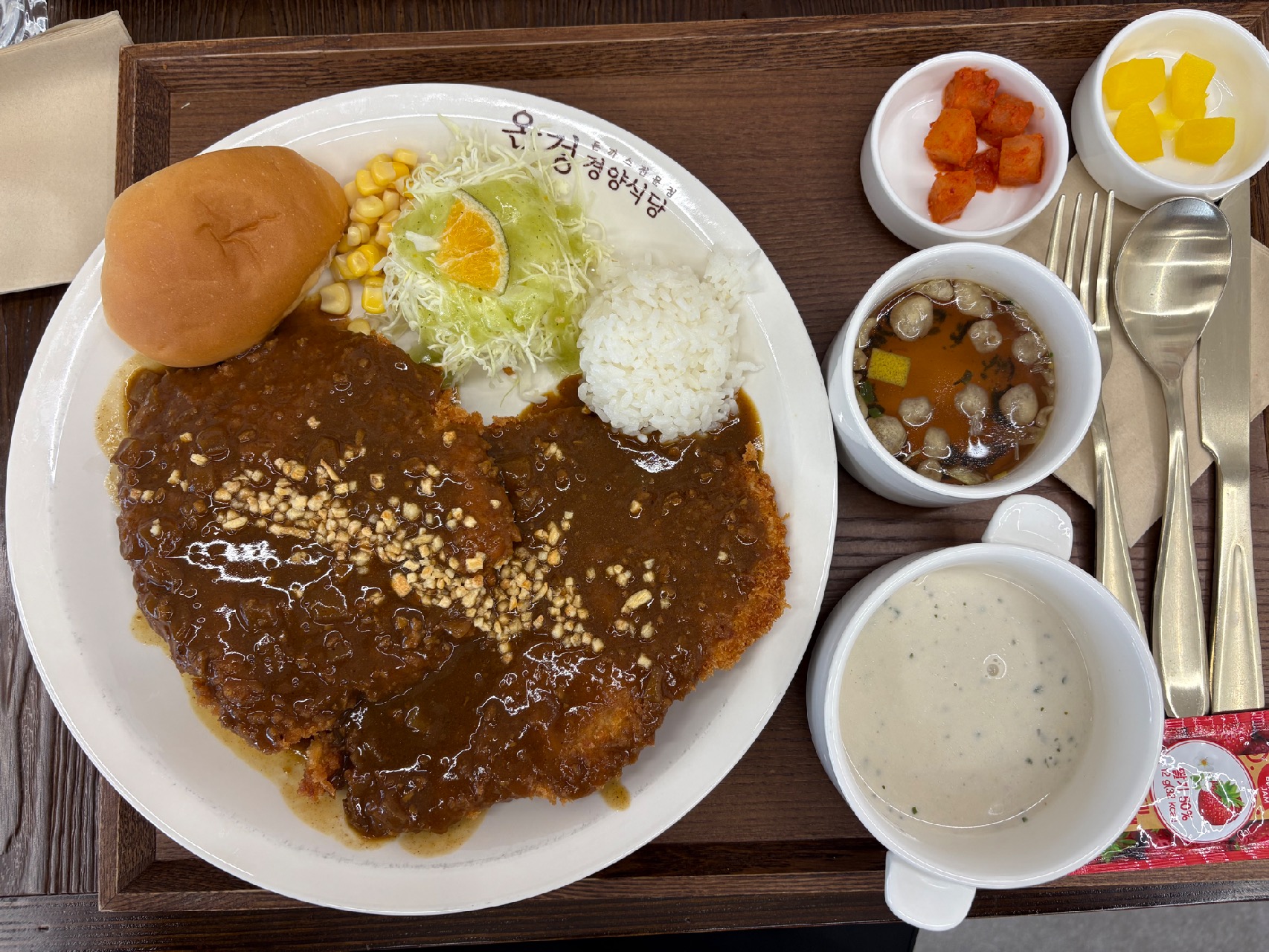 3. 정갈한 구성: 경양식당의 꽃이라고 할 수 있는 식전 스프부터 샐러드까지, 구성이 아주 알차서 한 끼 제대로 대접받는 기분이 듭니다.