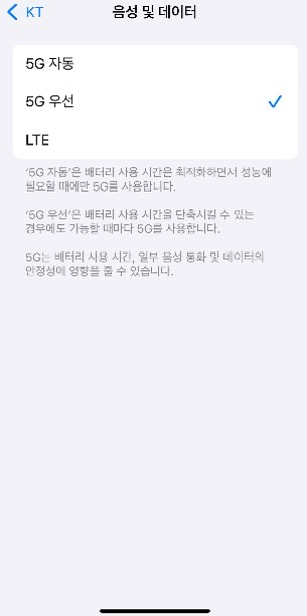 → 5G 요금제 사용 중이면 기본값이 5G 자동이거나 5G 우선일 수 있음. LTE 전환 가능 여부는 통신사 정책에 따라 다름.