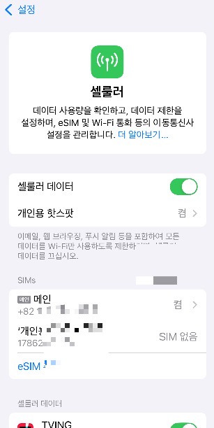 3. 셀룰러 요금제(사용 중인 회선) 선택 (SIM 리스트 중 현재 사용하는 번호 선택)