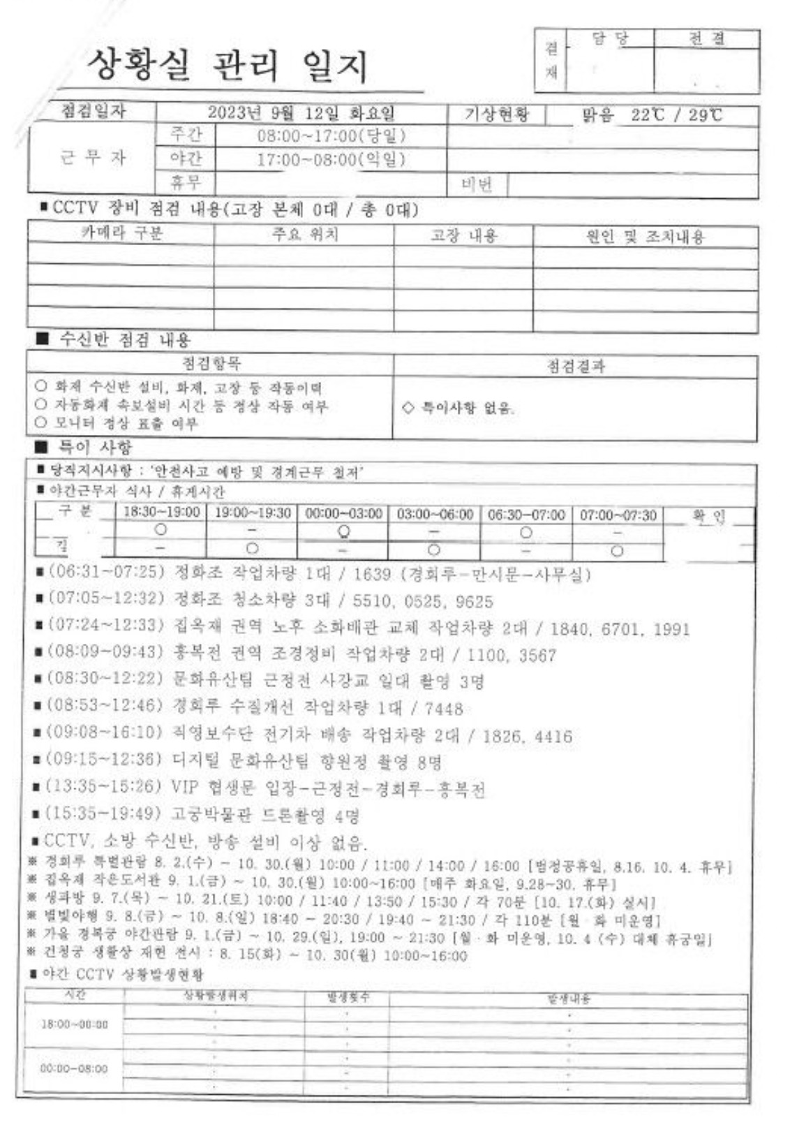 궁능유적본부 산하 경복궁관리소가 작성한 '상황실 관리 일지'에 따르면 김 여사는 오후 1시 35분부터 3시 26분까지 약 2시간 머문 것으로 파악됐습니다.