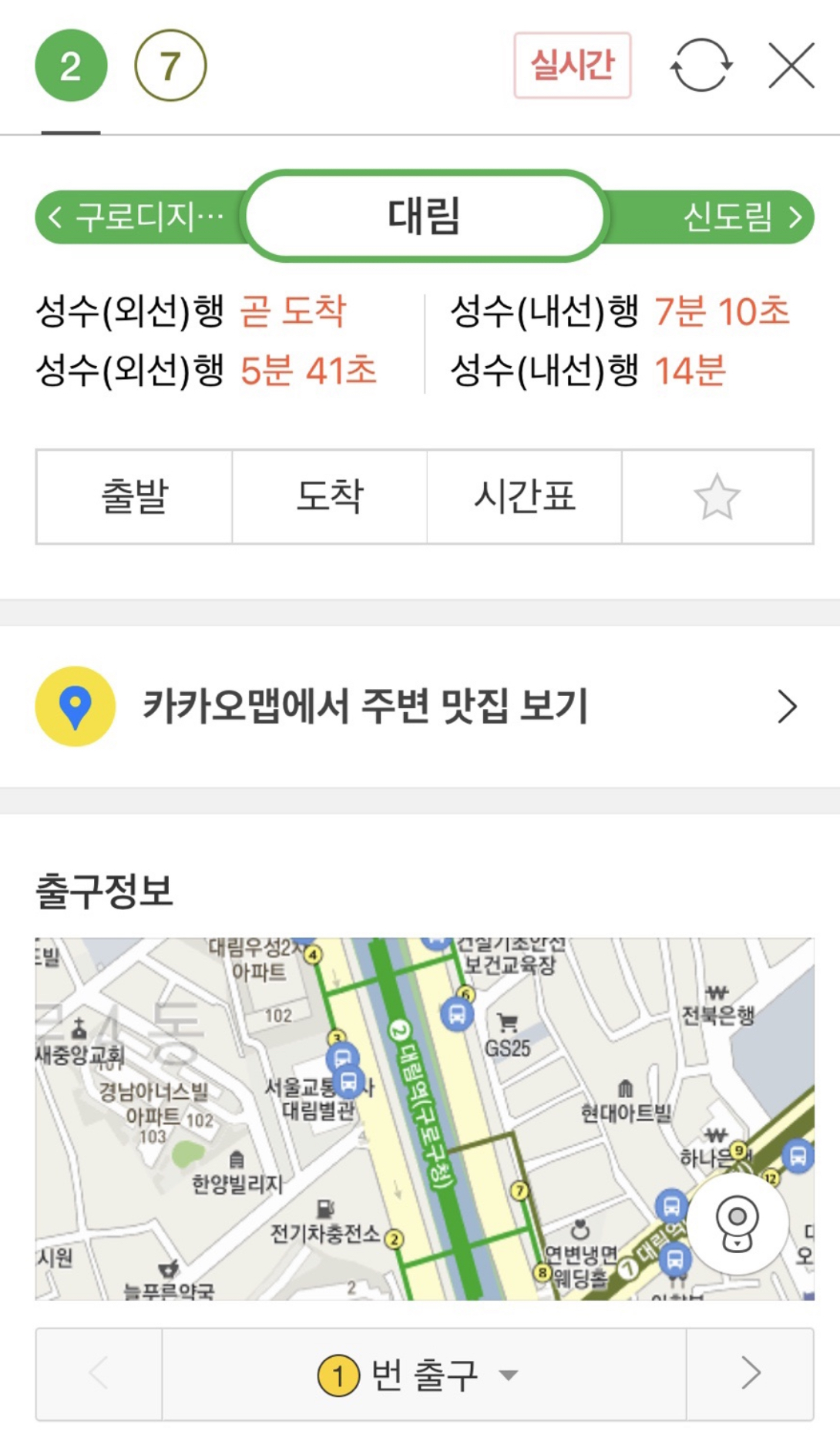 1. 지하철 앱(카카오 지하철)을 실행하고 역마다 정보를 확인해 보면 된다.