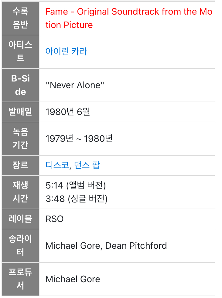 - “Fame”은 작곡가 Michael Gore, 작사가 Dean Pitchford가 영화 주제를 직접 메가히트로 만든 곡입니다.